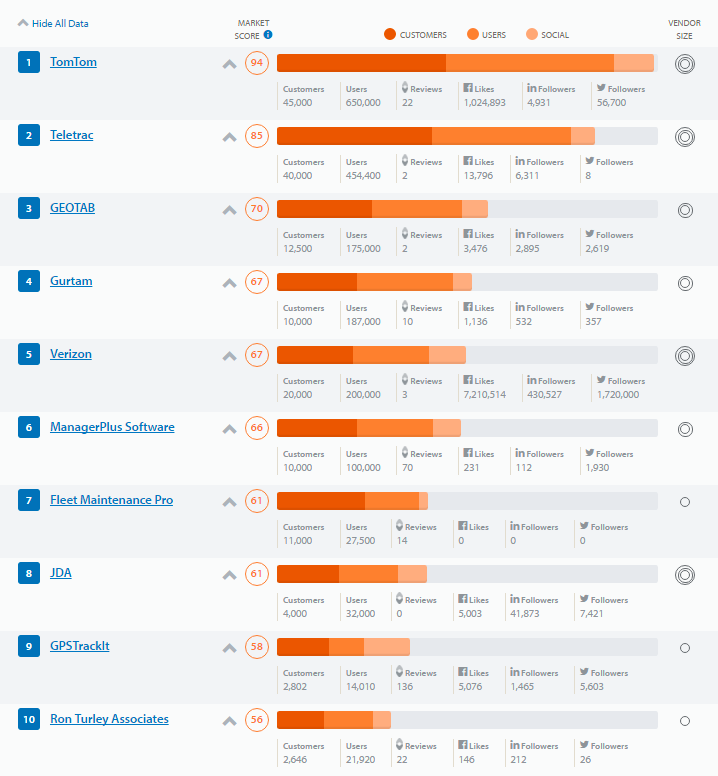 Esta calificación combina varias medidas de popularidad total: base de clientes, número de usuarios, presencia en línea y reseñas. Con aproximadamente 10,000+ de clientes, 180,000+ usuarios y una presencia en línea que incluye a casi 2000 seguidores, Wialon ocupó el 4to lugar del ranking, dejando a tales jugadores clave del mercado como Verizon, Omnitracs y Trimble