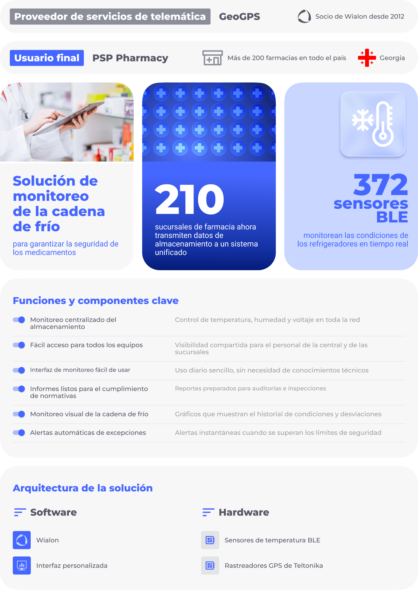 Instalaron sensores de temperatura BLE dentro de las unidades de almacenamiento con temperatura controlada en más de 200 sucursales. Envían la información a Wialon a través de los dispositivos GPS de Teltonika. Wialon procesa todos los datos recopilados y gracias a una integración vía API, todo se sincroniza al instante con la interfaz de control personalizada de GeoGPS, garantizando una visibilidad en tiempo real de las condiciones de almacenamiento de los medicamentos.