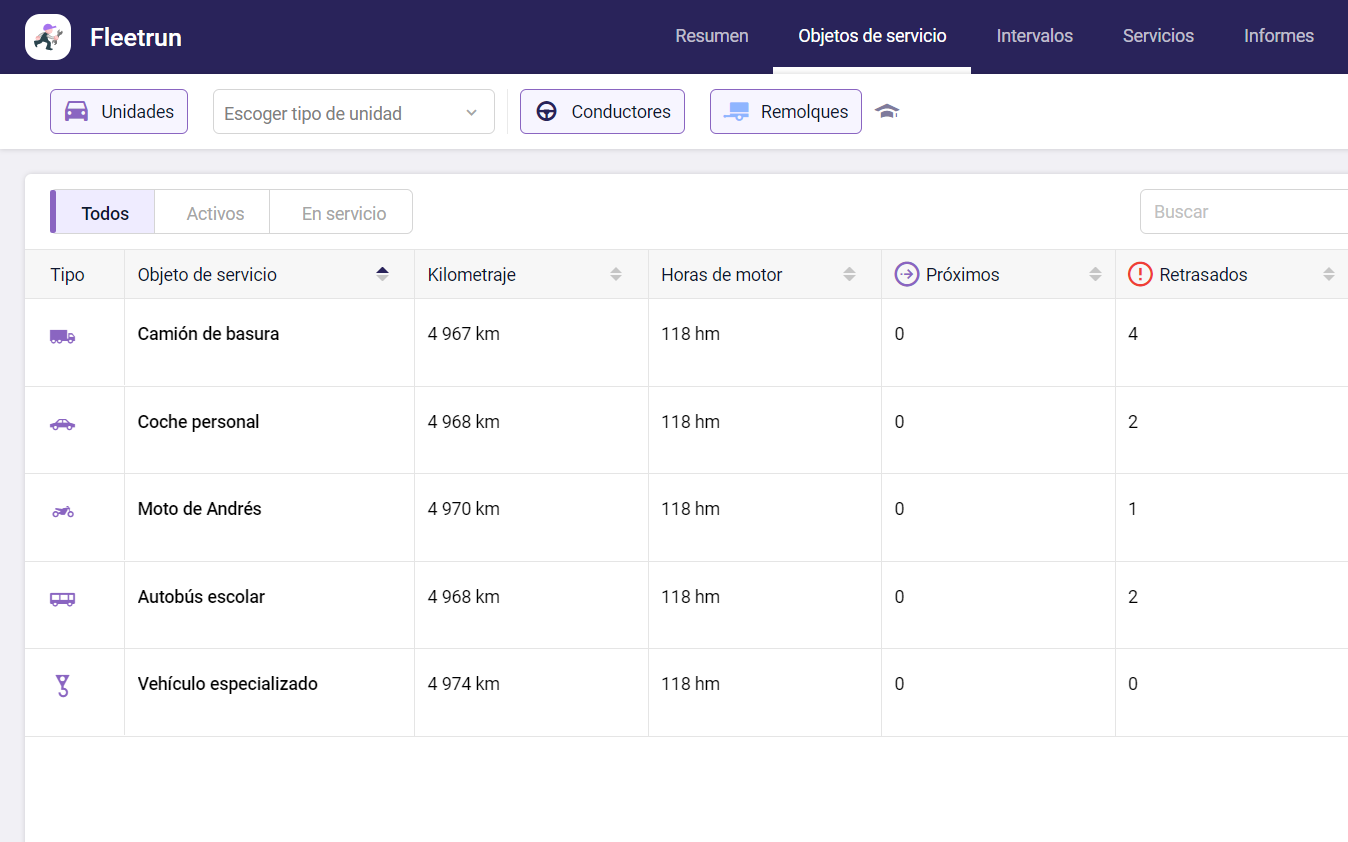 Visualización de la información sobre el kilometraje, las horas de motor, los servicios y de la descripción detallada de cada vehículo.